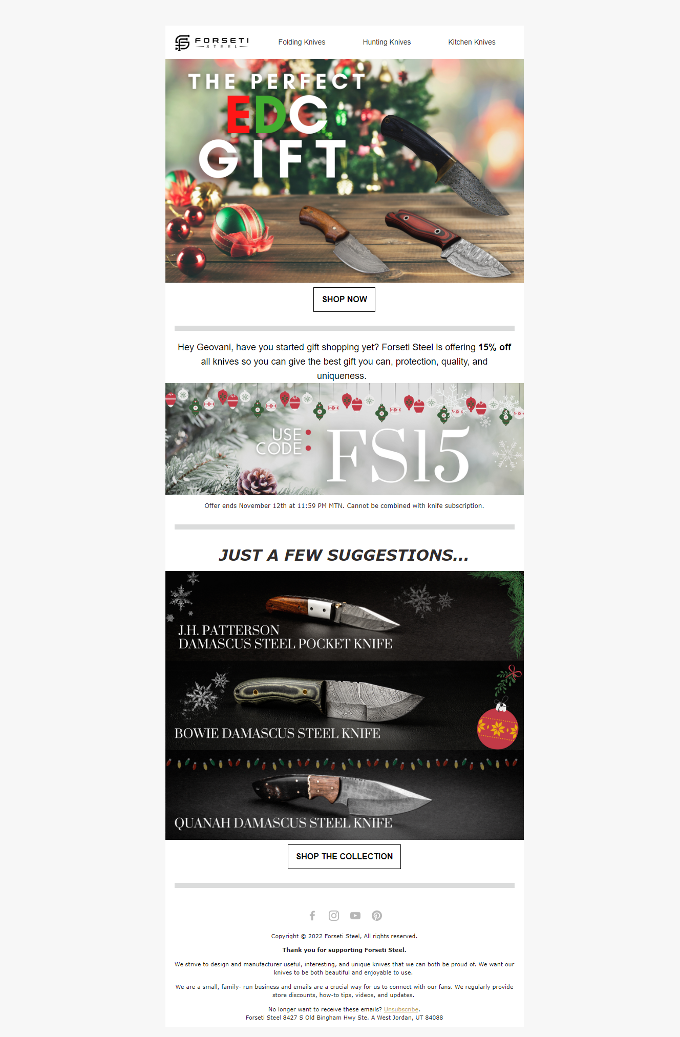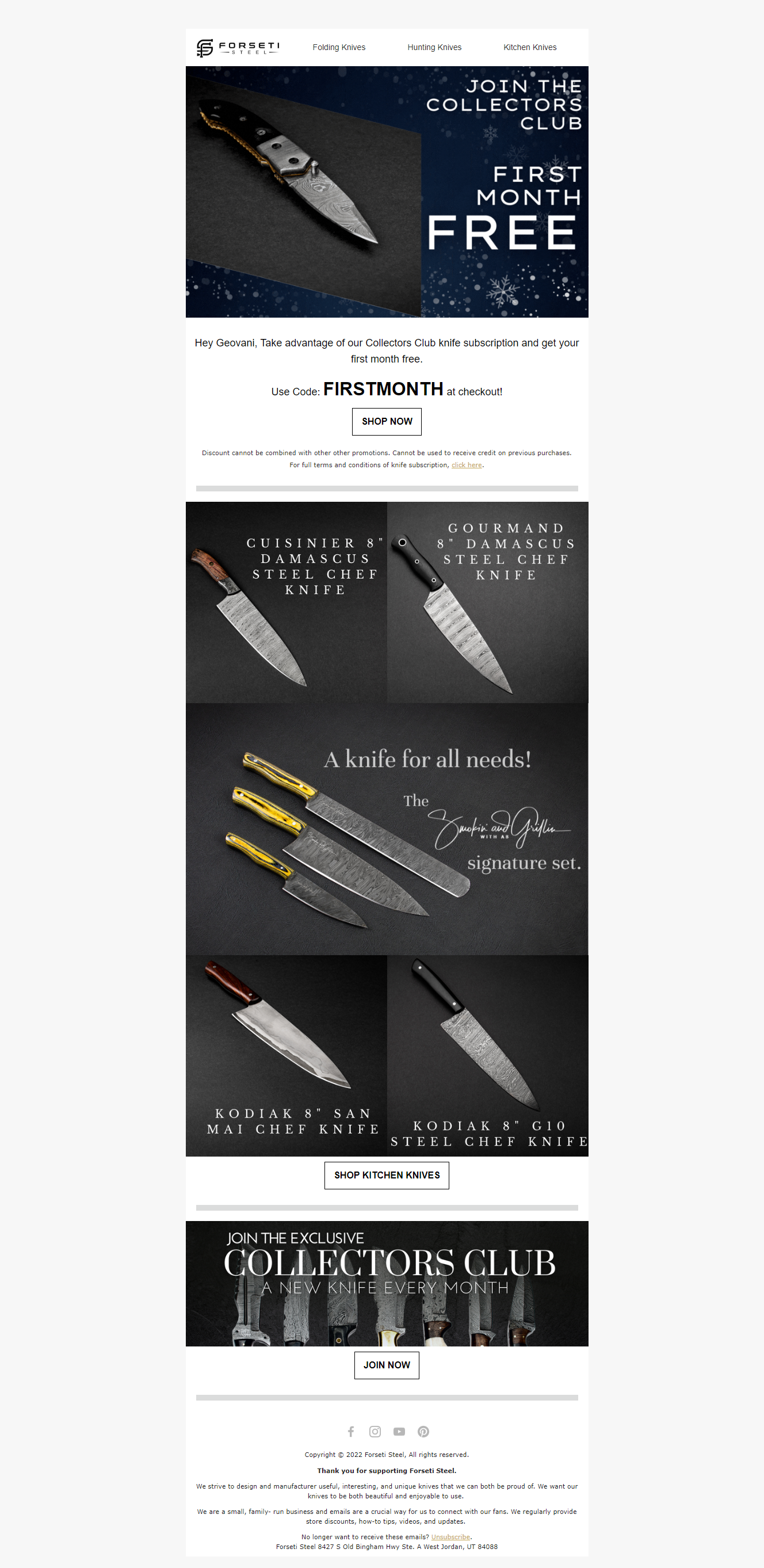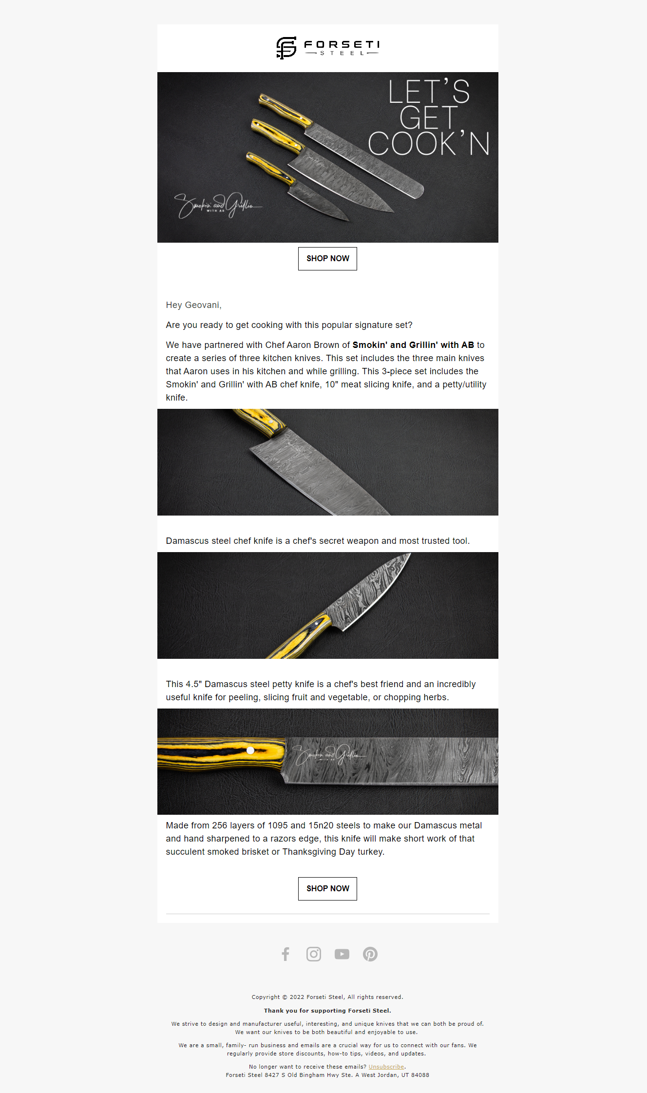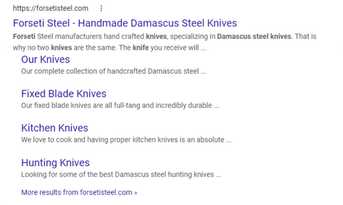 We have changed to include new search phrases like “Forseti“, “Forseti Steel“, and “Damascus steel knives” in order to take advantage of the new search opportunities brought about by a rise in brand recognition via social media. Links to additional features within a category aid Forseti Steel’s knife selection.